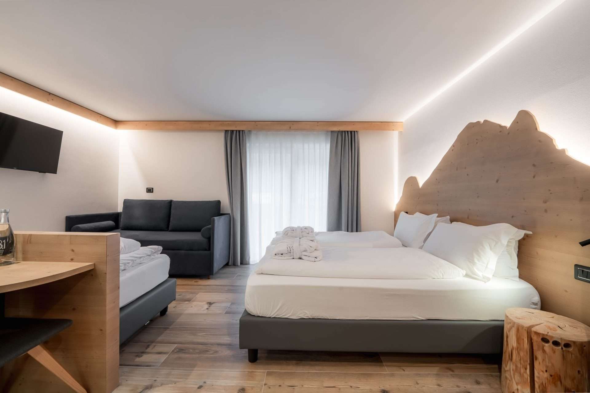 Camera arredata in legno di 26 m² che dispone di un letto matrimoniale, un letto singolo ed un comodo divano letto che può trasformarsi in letto a castello, TV a schermo piatto di 42 pollici, cassaforte, telefono, frigo, bollitore, Wi-Fi gratuito, balcone attrezzato con tavolino e poltroncine.