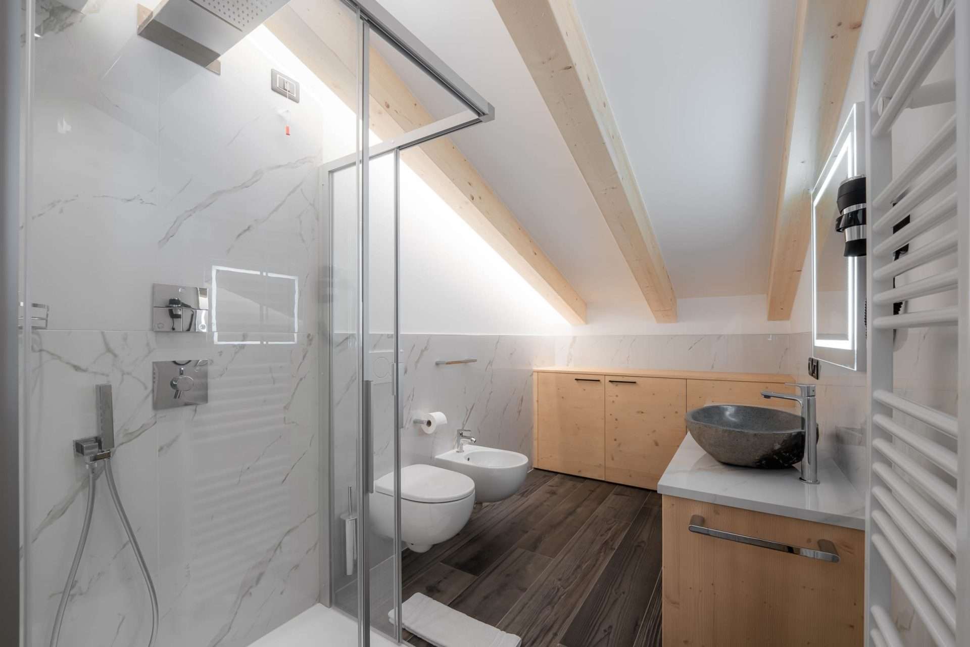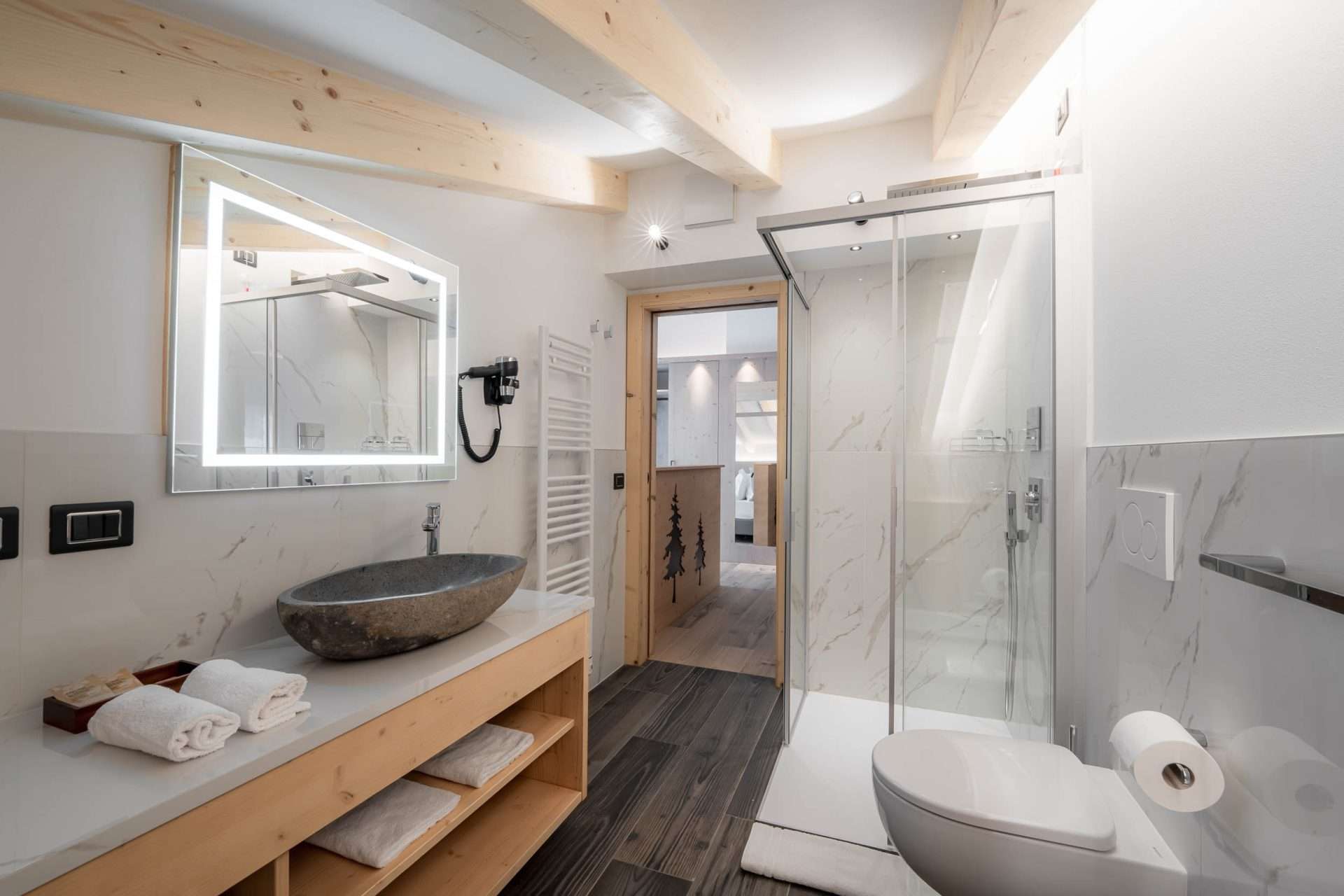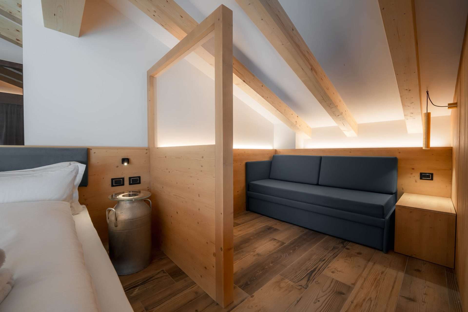 • Materiali e design Realizzata in caldo legno delle Dolomiti con travi a vista, in tipico stile alpino.